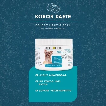 Unsere Medidog Kokos Paste hilft von innen, mit wertvollen Kokosflocken, Calcium und einem speziell abgestimmten Vitamin-B-Komplex, der alle wichtigen Vitamine erhält, sowie Biotin für Glanz und Pflege. So unterstützt du die Haut- und Fellgesundheit deines Lieblings auf ganz natürliche Weise.